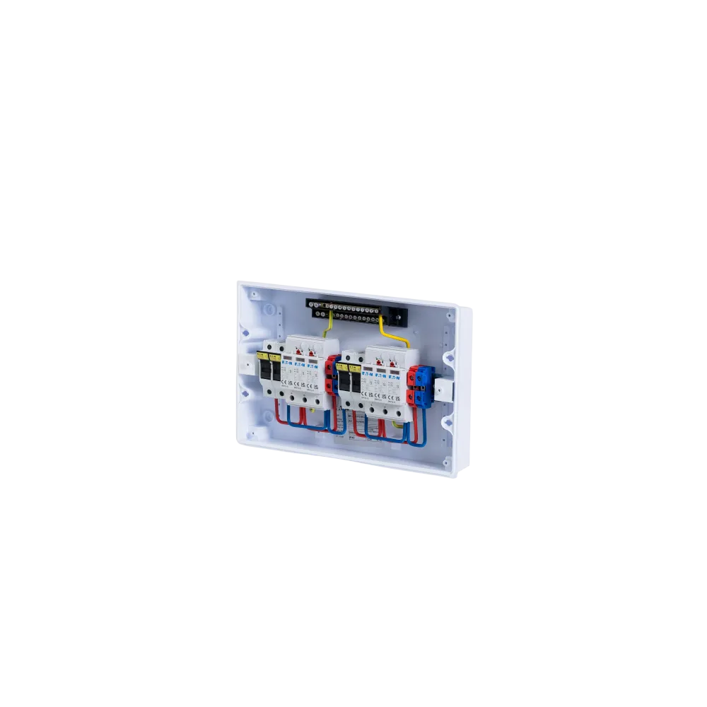 Rozváděč R-FVE-DC2 je určen pro **ochranu a jištění dvou DC stringů** z fotovoltaických panelů. Zajišťuje ochranu proti přepětí, zkratu a zpětnému proudu mezi jednotlivými větvemi a měničem. Použití přepěťových ochran třídy I+II zaručuje **účinnou ochranu systému i při úderu blesku do blízkého okolí**. Rozváděč je vhodný pro všechny běžné typy měničů – GoodWe, SolaX, Fronius, Huawei, Growatt aj.