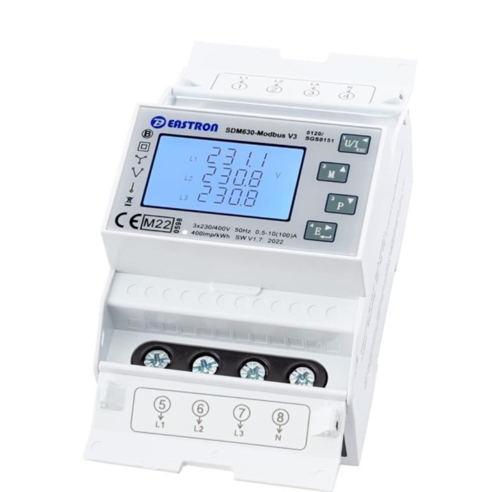 Eastron SDM630 Modbus V3 je pokročilý třífázový elektroměr navržený pro monitorování a řízení spotřeby, výroby i toku energie v rámci moderních instalací – od rezidenčních fotovoltaických systémů až po komerční budovy. Díky přímému připojení až 100 A na fázi (bez nutnosti externích proudových transformátorů) a rychlé komunikaci přes RS‑485 Modbus RTU je možné snadno integrovat do PLC, monitorovacích systémů i střídačů s podporou Modbus protokolu. :contentReference[oaicite:1]{index=1}