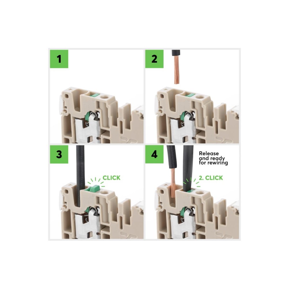 Oranžová barevná varianta umožňuje jednoznačné označení funkčních skupin, napětí nebo signálních větví v rámci rozvaděče. Konektor se snadno instaluje na standardní DIN lištu, má robustní šroubový mechanismus a je plně kompatibilní s příslušenstvím Weidmüller (můstky, koncové desky, označovače).