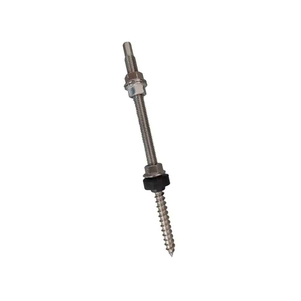 Kombišroub s horním šestihranem do dřeva 10×200 mm – nerezová ocel A2, kompletní sada s těsněním a maticí M10. Vhodný pro pevné kotvení FVE konstrukcí do dřevěných prvků.