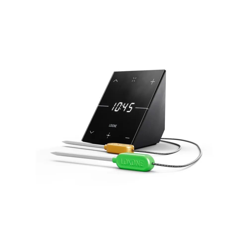 Loxone Touch & Grill Air je bezdrátový grilovací teploměr s dvěma sondami, sedmi dotykovými zónami, časovačem a teplotním alarmem – plně integrovatelný do systému Loxone Smart Home.